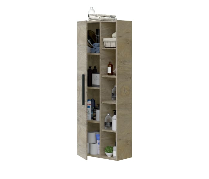 Columna de baño Bruntec Atenea en kit, color roble alaska, 51 cm x 135 cm x 25 cm compuesta por 1 puerta y 4 estantes fijos en el exterior, suspendida