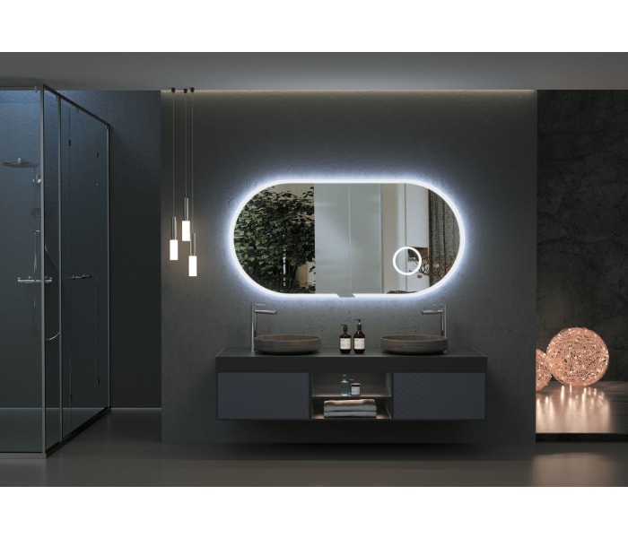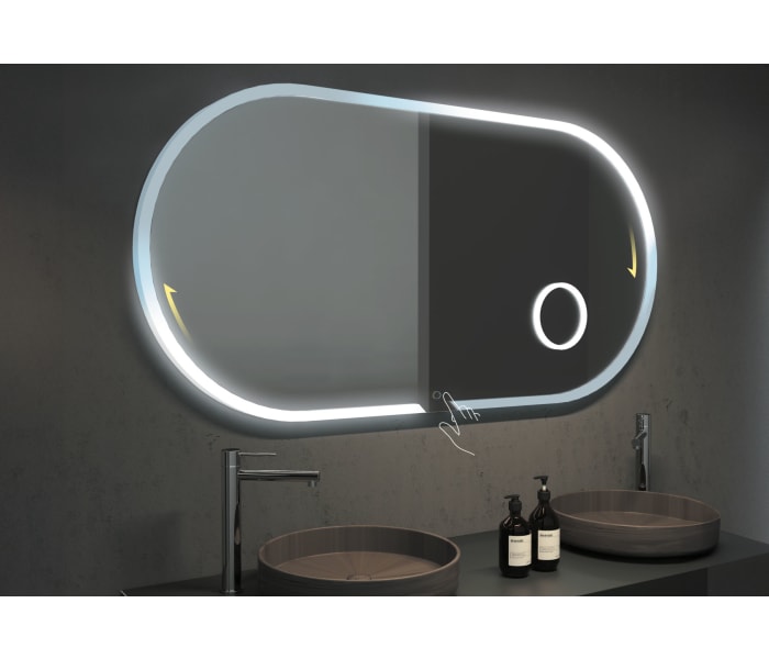 Disponible en medidas diversas (acho x alto): 100x55, 120x60, 140x70 cm. Este espejo elíptico con marco iluminado acrílico y acabado cromo destaca por ser perfecto para baños con poca luz.